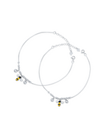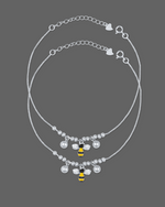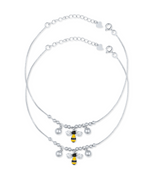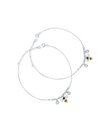 This image displays a charming 92.5 silver anklet. It features a delicate silver chain with a segment of small silver beads at the front. Dangling from this beaded section are two small, clear drop-shaped charms and a central, colorful bee charm with black and yellow stripes. The anklet appears to have an adjustable clasp for a comfortable fit.