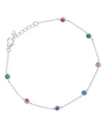 This vibrant sterling silver bracelet features a delicate chain adorned with seven round, bezel-set stones in a spectrum of colors including green, fuchsia, purple, blue, and orange. The bracelet is adjustable with an extender chain...