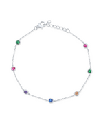 This vibrant sterling silver bracelet features a delicate chain adorned with seven round, bezel-set stones in a spectrum of colors including green, fuchsia, purple, blue, and orange. The bracelet is adjustable with an extender chain and a lobster clasp, offering a playful and colorful accent.