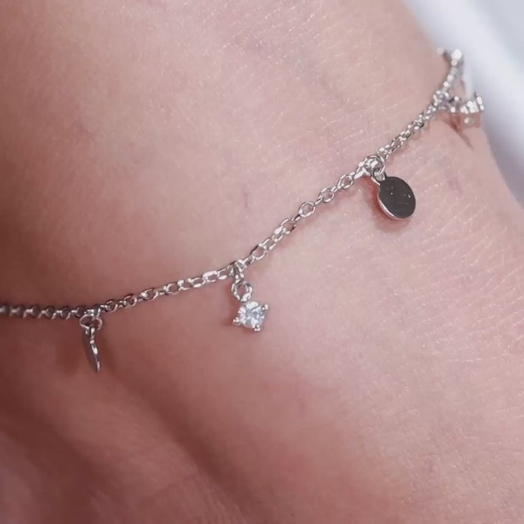 Crafted in 925 sterling silver, the Lustre Disc Anklet features a sequence of polished circular forms enhanced with subtle sparkle. Balanced and fluid in design, this anklet adds a refined glow and effortless elegance to everyday wear.