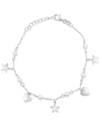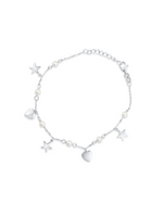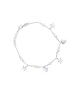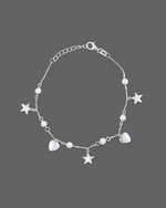 This delicate silver bracelet features an enchanting array of charms. Shimmering silver stars and polished heart charms are interspersed with luminous round pearls along its dainty chain. It fastens securely with a classic lobster clasp, offering a charming and elegant accessory for any occasion.