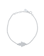 This is a sterling silver bracelet featuring a delicate chain and a prominent Hamsa hand charm. The Hamsa hand is intricately detailed, fully paved with small, sparkling cubic zirconia stones. The bracelet is adjustable, secured...