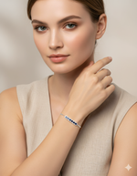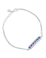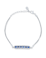 This is a sleek and elegant 925 silver bracelet, featuring a rectangular centerpiece adorned with blue baguette-cut stones CZs—set in a neat horizontal row. These are bordered by a halo of tiny, clear white stones, adding a subtle sparkle. The bracelet includes a fine dual-chain design and an adjustable lobster clasp closure, ensuring a secure and customizable fit. Its minimalist yet refined design makes it ideal for both daily wear and special occasions.