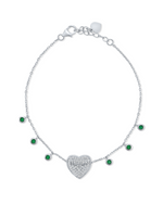 This is a charming 925 silver bracelet featuring a pave-set heart centerpiece sparkling with clear white stones. The bracelet is elegantly accented with green round-cut stones that dangle delicately along the fine silver chain, adding a touch of playful elegance. It includes an adjustable clasp closure for a secure and comfortable fit. Ideal for romantic gifting or everyday wear, this piece blends elegance with a hint of whimsy.