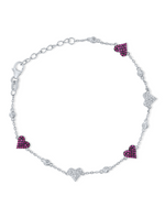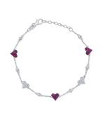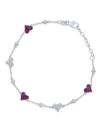 This sterling silver bracelet features a delicate chain adorned with alternating heart-shaped and round stone embellishments. Three of the hearts are fully paved with vibrant fuchsia or pink stones, while the other two hearts are paved with clear, sparkling stones. Interspersed between the hearts are round, bezel-set clear stones. The bracelet is adjustable with an extender chain and a lobster clasp, offering a playful and romantic design.