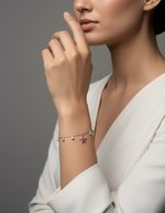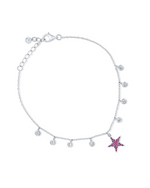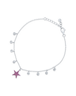 This charming 925 silver bracelet features a delicate chain adorned with multiple bezel-set clear stones dangling at various points. A prominent five-pointed star charm, fully paved with vibrant pink or fuchsia stones, hangs centrally. The bracelet is adjustable with an extender chain and a lobster clasp, and a small, single bezel-set clear stone also dangles from the extender.