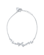 This is a dainty and feminine 925 silver bracelet featuring a charming central bow motif encrusted with tiny sparkling white stones. Flanking the main bow are additional mini bow accents and delicate floral-like stone settings, creating a whimsical and graceful look. The bracelet is finished with a sleek box chain and an adjustable clasp with a heart charm, offering both style and a secure fit. Perfect for adding a sweet, elegant touch to any outfit.