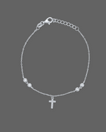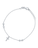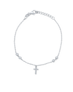 This sterling silver bracelet features a delicate chain with a central pavé-set cross charm. Along the chain, two bezel-set clear round stones are symmetrically placed on each side of the cross. The bracelet is adjustable with an extender chain and a lobster clasp, offering a meaningful and elegant design.