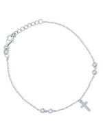 This sterling silver bracelet features a delicate chain with a central pavé-set cross charm. Along the chain, two bezel-set clear round stones are symmetrically placed on each side of the cross. The bracelet is adjustable...