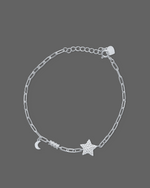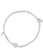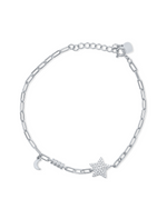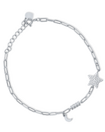 This trendy sterling silver bracelet features a paperclip chain with a central star charm, fully paved with sparkling cubic zirconia. Adjacent to the star are three baguette-cut stones set in a bar, and a tiny crescent moon charm. The bracelet is adjustable with an extender chain and a lobster clasp, offering a celestial and modern aesthetic.