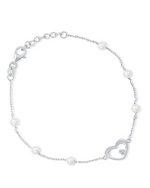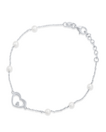 This delicate sterling silver bracelet features a charming open heart motif, containing a single sparkling clear stone. The fine chain is elegantly interspersed with five lustrous white pearls. The bracelet is adjustable with an extender...