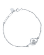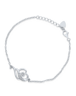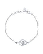 This delicate 925 silver bracelet features a central design of intertwined polished silver curves, forming a heart-like shape. Nestled within this design is a single, prominent brilliant-cut clear stone, with smaller pavé-set stones accenting one of the curves. The bracelet is completed with a fine chain, an adjustable extender, and a lobster clasp, along with a small heart tag.
