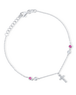 This elegant sterling silver bracelet features a delicate chain with a central pavé-set cross charm. Along the chain, four bezel-set round stones are symmetrically placed, alternating between clear and vibrant fuchsia/pink. The bracelet is adjustable with an extender chain and a lobster clasp, offering a meaningful and colorful design.