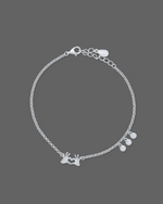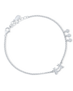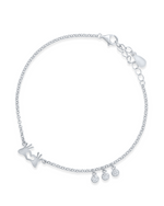 This playful 925 silver bracelet features a unique central charm depicting two hands forming a heart shape. Complementing this, three small, round, bezel-set clear stones dangle elegantly on one side. The bracelet has a fine...