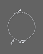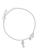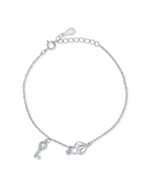 This enchanting 925 silver bracelet features a romantic heart-shaped lock charm paired with a sparkling key pendant, symbolizing love and connection. A petite round white stone adds a subtle hint of brilliance. The bracelet is designed with a delicate cable chain and an adjustable clasp closure, ensuring a perfect fit. Ideal as a gift or a meaningful accessory, it blends symbolism and style beautifully.