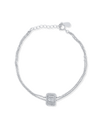 This elegant silver bracelet features a central rectangular motif, possibly adorned with CZ stones, creating a brilliant focal point. The delicate chain appears to be a twisted or braided design, adding texture and visual interest. It includes an adjustable clasp for a customizable fit, making it a sophisticated accessory suitable for various occasions.