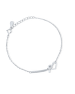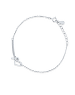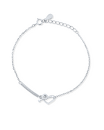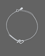 This dainty silver-toned bracelet features a minimalist design with a prominent open heart charm at its center. One side of the heart connects to a bar embellished with sparkling cubic zirconia stones, adding a subtle gleam. The delicate chain and adjustable clasp ensure a comfortable and secure fit, making it a lovely and understated accessory.