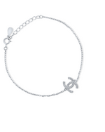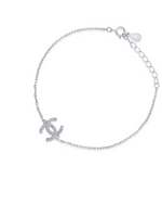 This sleek silver bracelet features a prominent interlocking "CC" style motif at its center, meticulously studded with sparkling cubic zirconia stones. The delicate chain complements the dazzling centerpiece, offering a refined and elegant aesthetic. Equipped with an adjustable clasp, this bracelet provides a comfortable and secure fit, making it a sophisticated accessory.