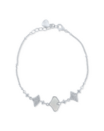 This charming silver-toned bracelet features a central irregular shaped, possibly mother-of-pearl, accent flanked by two sparkling star or quatrefoil-shaped motifs, intricately set with cubic zirconia stones. The delicate chain is adjustable, ensuring a perfect fit. This piece combines subtle elegance with a touch of playful sparkle, making it versatile for various occasions.