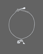 This charming 925 silver bracelet features two elegant dangling charms—a sparkling heart-shaped lock encrusted with shimmering white stones, and a delicate key pendant with a heart-cut handle. The fine silver chain adds a minimalist touch, while the adjustable clasp ensures a secure and comfortable fit. Symbolizing love and trust, this bracelet is a perfect gift or a romantic addition to any jewelry collection.