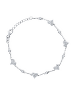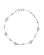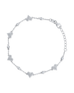 This enchanting silver bracelet features a delicate chain interspersed with multiple sparkling heart-shaped motifs, each meticulously set with cubic zirconia stones. Tiny clear beads or small charms are also spaced along the chain, adding to its dainty appeal. The bracelet is equipped with an adjustable clasp, ensuring a comfortable and secure fit, making it a beautiful and romantic accessory.