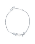 This elegant 925 silver bracelet showcases a refined design featuring a luminous white pearl at the center, flanked by delicate leaf-shaped motifs. Some leaves are accented with fine white stones, adding a subtle sparkle. The sleek silver chain with an adjustable clasp ensures comfort and versatility. A perfect blend of nature-inspired charm and timeless sophistication.