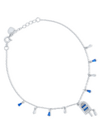 This playful 925 silver bracelet features a vibrant popsicle charm encrusted with dazzling blue baguette stones and shimmering white accents. The chain is adorned with alternating blue and white gemstone danglers, adding a fun, youthful sparkle. Perfect for adding a whimsical twist to your everyday look.