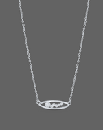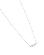 This is a minimalist 925 sterling silver necklace featuring a fine chain and a horizontal oval pendant. The pendant has an unidentifiable inscription or design within its frame, suggesting a personalized or branded element. Its polished finish and subtle elegance make it a versatile accessory for everyday wear.