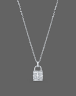 This image features a delicate, silver necklace with a unique pendant. The pendant is an abstract or stylized representation of a key, possibly formed by multiple rectangular or baguette-cut clear gemstones set together to create its shape, giving it a modern and sparkling appearance. The chain is fine and complements the elegant design of the pendant.