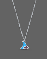 This image features a charming silver necklace with a whimsical pendant. The pendant depicts a crescent moon in a vibrant blue enamel or resin, partially obscured by a small, dark red or maroon cloud-like element beneath it, creating a playful and colorful celestial design.