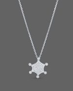 This is a charming silver chain necklace featuring a stylized snowflake or star-shaped pendant. The pendant has a hexagonal outline, with six points, and is adorned with pave-set clear gemstones on its surface, complemented by larger, round clear gemstones at each point, creating a sparkling, delicate design.