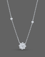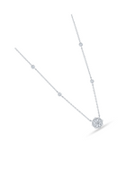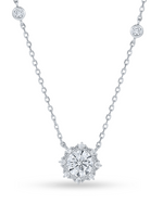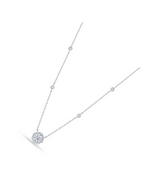 This exquisite 925 silver necklace features a delicate chain accented with evenly spaced, bezel-set cubic zirconia (CZ) stones. The focal point is a dazzling circular pendant, where a brilliant central CZ stone is encircled by a halo of smaller CZs, creating a radiant, floral-like cluster. This piece combines classic elegance with sparkling sophistication, ideal for adding a touch of glamour.