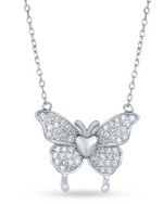 This delightful silver necklace features a charming butterfly pendant as its central motif, exquisitely detailed with shimmering cubic zirconia (CZ) stones adorning its wings. The delicate sterling silver chain provides a subtle backdrop, allowing the sparkling butterfly to truly stand out. This piece evokes a sense of whimsical elegance, making it a perfect accessory for adding a touch of grace and sparkle to any outfit.