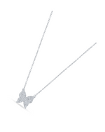 This enchanting silver necklace features a beautifully rendered butterfly pendant, its wings entirely pave-set with dazzling cubic zirconia (CZ) stones for maximum sparkle. The delicate sterling silver chain provides a subtle yet secure setting, allowing the brilliant butterfly to be the focal point. This piece is a perfect blend of whimsy and elegance, adding a touch of natural beauty and light to any attire.