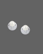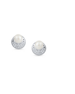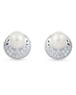 These stylish silver stud earrings feature a unique half-moon design. A lustrous pearl forms the upper half, while the lower crescent is adorned with sparkling Cubic Zirconia (CZ) stones. The modern setting and brilliant accents make these earrings a contemporary take on classic pearl jewelry, perfect for adding a subtle sparkle to any look.