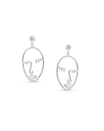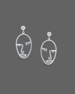 These artistic silver earrings showcase a unique, abstract face outline design, reminiscent of modern art. Each earring is suspended from a single, shimmering cubic zirconia (CZ) stud, adding a subtle touch of sparkle. The minimalist yet expressive facial silhouette offers a contemporary and sophisticated aesthetic, making these earrings a distinctive statement piece for those who appreciate unique jewelry.