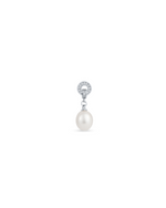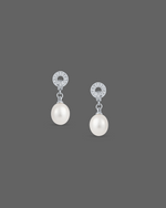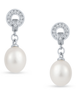 These elegant silver drop earrings feature a luminous, elongated pearl suspended from a chic, pavé-set Cubic Zirconia (CZ) hoop. The sparkling CZ adds a touch of brilliance and sophistication to the classic beauty of the pearl. Perfect for both formal events and adding a refined touch to everyday wear, these earrings exude timeless charm.
