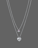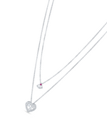 This image showcases a set of two layered silver necklaces. The shorter chain features a petite, fan-shaped pendant with a small pink or red gemstone at its center. The longer chain boasts a sparkling heart-shaped pendant, likely pave-set with numerous clear gemstones, giving it a radiant and romantic appearance.