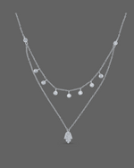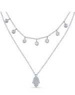 This is a layered 925 silver necklace featuring a delicate design with sparkling CZ stones. The upper layer of the chain is adorned with multiple bezel-set round CZ stones, while the lower, longer chain elegantly suspends a pave-set CZ Hamsa hand charm. This stylish piece combines modern layering with a symbolic motif, offering a touch of sparkle and meaning.