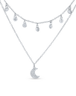 This elegant 925 silver necklace features a layered design, offering a celestial-inspired sparkle. The upper chain is adorned with multiple dangling, bezel-set cubic zirconia (CZ) stones, creating a shimmering fringe effect. The lower, longer chain gracefully suspends a charming crescent moon charm, entirely pave-set with brilliant CZ stones. This piece combines contemporary layering with a touch of whimsical beauty.