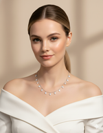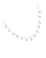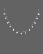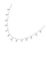 This elegant 925 silver necklace features a delicate chain adorned with numerous oval-shaped cubic zirconia (CZ) stones. Each CZ is individually set and gracefully dangles along the length of the necklace, creating a continuous line of shimmering accents. The evenly spaced design offers a sophisticated and brilliant appeal, perfect for adding understated glamour.