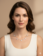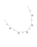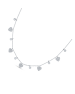 This delightful 925 silver necklace features a charming design with alternating elements along its delicate chain. It showcases sparkling pave-set cubic zirconia (CZ) heart charms interspersed with individual bezel-set round CZ stones. The combination creates a graceful and romantic cascade of brilliance, making it a sweet and shimmering accessory for any occasion.