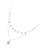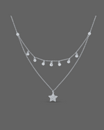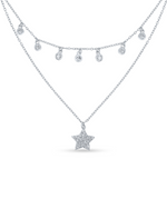 This stunning 925 silver necklace features a chic layered design, combining classic sparkle with a celestial touch. The upper chain is adorned with multiple dangling, bezel-set cubic zirconia (CZ) stones, creating a graceful fringe. The lower, longer chain elegantly suspends a brilliant star-shaped charm, completely pave-set with dazzling CZ stones. This piece offers a harmonious blend of contemporary style and timeless allure.