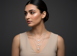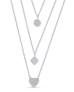 This elegant silver necklace features a stylish layered design, presenting three distinct pendants on separate chains. The shortest chain holds a circular disc pendant, followed by a square-shaped pendant on the middle chain, and a charming heart-shaped pendant on the longest chain. Each pendant is meticulously adorned with pave-set cubic zirconia (CZ) stones, offering a brilliant sparkle and a cohesive, sophisticated look.