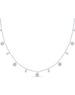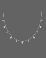 This charming 925 silver necklace features a delicate chain adorned with an array of sparkling cubic zirconia (CZ) stones. It showcases a playful combination of round, cluster-set CZ charms and smaller, individual geometric CZ accents, creating a graceful drop effect along the neckline. The scattered design offers a continuous shimmer, making it a versatile and eye-catching piece.