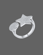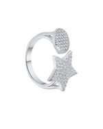 This striking 925 silver ring features an open design with two distinct, pavé-set Cubic Zirconia elements. A brilliant five-pointed star, completely encrusted with sparkling CZs, is paired with a smaller, equally dazzling oval or tear-drop shape. The polished silver band elegantly connects these two shimmering motifs, creating a modern and eye-catching piece.