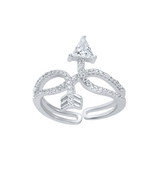 This is a striking adjustable ring, likely silver-toned, showcasing a sparkling arrow motif. A prominent trillion-cut cubic zirconia forms the arrowhead, while the shaft and fletching are intricately pave-set with smaller CZ stones. The arrow gracefully intertwines with a second pave-set band, creating a brilliant and captivating design.