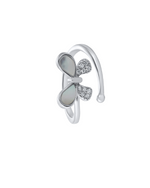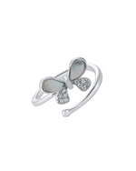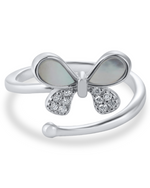 This is a delicate, open-ended ring featuring an elegant butterfly motif. The butterfly's upper wings are crafted from iridescent mother-of-pearl, while its lower wings sparkle with clusters of brilliant cubic zirconia. The polished, silver-toned band ends with a small, smooth bead, creating a charming and adjustable design.