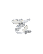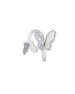 This is an elegant open-ended ring featuring a dynamic butterfly design. Two wings are crafted from lustrous mother-of-pearl, while the other two sparkle with a mix of baguette and round cubic zirconia stones. The polished silver-toned band gracefully supports this captivating and sophisticated piece.