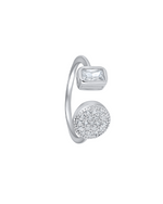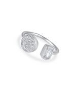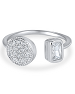 This is a contemporary open-ended ring in silver-toned metal, featuring two distinct geometric elements. One end has a dazzling pave-set round disc with cubic zirconia, while the other showcases a prominent rectangular-cut cubic zirconia. The sleek band elegantly connects these contrasting shapes, creating a modern and striking design.